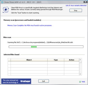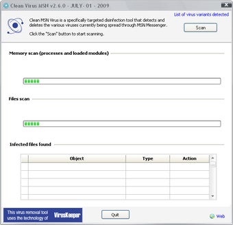 A base de dados de vírus do Clean Virus MSN registra quase 4 mil variações de ameaças que usam oMessenger para se espalhar. Basta rodar o antivírus e clicar em “Scan” para o Clean Virus MSN verificar o seu sistema e apagar os arquivos perigosos na hora.